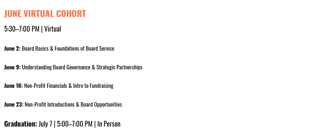 BPI is designed for professionals interested in serving on nonprofit boards or committees who want a clear understanding of board governance, expectations, and impact. Participants may choose the cohort that best fits their schedule.
